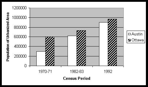 history makes for a more exciting story, but Ottawa's has brought about superior results. Notes 1. United Nations, Demographic Yearbook (New York: United Nations, 1972, 1984 and 1994). 2. City of Ottawa, "Discover Ottawa: Key Facts About Ottawa" <http://city.ottawa.on.ca/ottawa/city/web/d/d1/d1-keyfacts.html>, Mar. 28, 1999 and Capital Area Planning Council, "Population Change for Counties and Places in the Capital Area Planning Region 1990-1998", <http://www.capco.state.tx.us/Publication.htm>, Apr. 3, 1999. 3. Statistics Canada, "Statistical Profile of Canadian Communities," <http://ww2.statcan.ca/english/profil/> Apr. 3, 1999. 4. Capital Area Planning Council, "Population Change for Counties and Places in the Capital Area Planning Region 1990-1998", <http://www.capco.state.tx.us/Publication.htm>, Apr. 3, 1999. 5. Texas Workforce Commission "Austin-San Marcos MSA-Texas Labor Market Information" <http://www.twc.state.tx.us>, Apr. 5, 1999 and City of Ottawa, "Discover Ottawa: Key Facts About Ottawa" <http://city.ottawa.on.ca/ottawa/city/web/d/d1/d1-keyfacts.html>, Mar. 28, 1999. 6. Ottawa Economic Development Corp., "Ottawa's Share of Canadian Advanced Technology Employment,"<http://www.ottawaregion.com/ottawafacts/table5_3.htm>, and "Advanced Technology Employment," <http://www.ottawaregion.com/ottawafacts/table5_1.htm>, Apr.15, 1999. 7. Texas Comptroller of Public Accounts, "Capital Regional Outlook" <http://www.window.state.tx.us/ecodata/regional/capital/capasmsa.html>, Apr. 4, 1999. 8. Statistics Canada "Selected Income Statistics for Individuals, Families and Households, 1991 and 1996 Censuses, Census Metropolitan Areas," <http://www.statcan.ca/english/Pgdb/People/Families/famil61e.htm>, Apr. 2, 1999 and U.S. Census Bureau, "Estimated Median Household Income by County, Texas," <http://www.census.gov/hhes/www/saipe/saipe93/estimate.html>, Apr. 15, 1999. Average 1995 currency conversion rate used is $1 Canadian = $0.73 US. 9. Ira M. Robinson and Gerald Hodge, "Growing Pains", Plan Canada, May 1998, p. 12. 10. Robert Cervero, The Transit Metropolis: A Global Inquiry (Washington, D.C.: Island Press, 1998), p. 258. 11. Ibid., p. 253. 12. Statistics Canada, "Nation Tables," <http://www.statcan.ca/english/census96/nation.htm>, Apr. 1, 1999. 13. Regional Municipality of Ottawa-Carlton, "Draft Transportation Master Plan," <http://www.rmoc.on.ca/Transport/tmp-rep.html>, Apr. 25, 1999. 14. Cervero, The Transit Metropolis, p. 251. 15. Ibid., p. 241. 16. Ibid., p. 258. 17. Ben Heimsath, Chairman of the Citizen's Planning Committee (a city-appointed advisory body). Quoted in Mike Greenberg, "Growth," Metropolis, Dec. 1996 p. 56. 18. Soft costs include such expenses as architectural and engineering services, legal support, financing charges and administrative costs. 19. Austin voters passed a measure in 1989 that placed strict controls on subdivisions in the aquifer recharge zones. The controls included density caps, impervious surface standards and mandated preservation of large trees. The aquifer recharge zones are shown in Figure 9. 20. Dowell Meyers, Priorities in Austin's Quality of Life: The Evidence From the Citizens (Austin: University of Texas at Austin, 1985) p. 25, 32, 39. 21. OC Transpo, "Facts and Figures: Ridership," <http://205.250.109.3/secondweb/administ/Administration/populatn.html>, Apr. 25, 1999. 22. City of Austin, "City of Austin Land Use Data: 1990 Land Use by Planning Area in Acres," <http://www.ci.austin.tx.us/landuse/ludata.htm>, Apr. 11, 1999. 23. Pietro S. Nivola, Laws of the Landscape: How Policies Shape Cities in Europe and America (Washington, D.C., Brookings Institution Press, 1999), p. 12-34. 24. Regional Municipality of Ottawa-Carlton, "Regional Profile: How We Travel," <http://www.rmoc.on.ca/plan/rp52.htm>,
